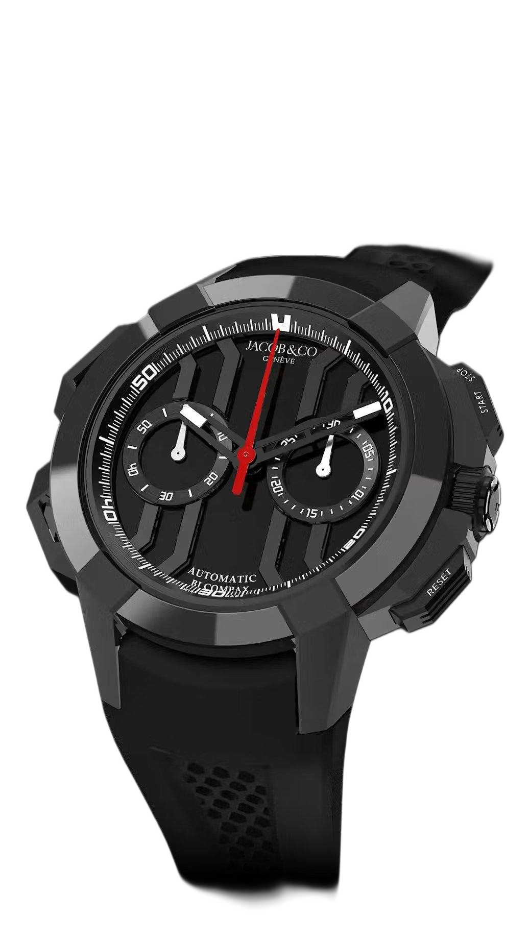 | Movement: | Caliber: Exclusive Skeleton Bi-Compax Chronograph Self-Winding Jacob&Co JCAA05; Diameter: 30.40mm; Height: 8.40mm; Components: 260; Power Reserve: 48-Hours; Frequency: 28'800 vib/h (4 Hz); Jewels: 27; System: Column-Wheel Balance Screws; Anti-shock; Finishing: Open Barrel; Column-Wheel finishes: Angled, Polished and Drawn; Anthracite Rotor with Red Lacquered Engraving "Jacob & Co Genève", Circular Grained Bridges. |