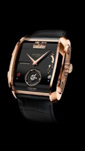 The new 42 × 44mm rose gold case takes its proportions from Art Deco, a nod to the 1920s setting of the film’s prequel storyline. Flying tourbillon, dual power reserves, black lacquer dial with a portrait of Don Corleone, and a caseback engraved with the actual musical score. Limited to 74 pieces — a reference to the film’s 1974 release — at USD 440,000.
