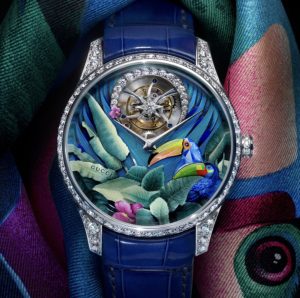 Decorative watchmaking was Gucci’s theme this year. The G-Timeless Métiers d’Art collection comprises four tourbillon models referencing archival silk scarves from the 1960s to 1980s — motifs including a tiger emerging from foliage and a tropical toucan, rendered through micro-painting, grand feu enamel, hand engraving, and featherwork by specialist Nelly Saunier. The 25H, the house’s most technically credible proposition, was updated with rainbow-coloured baguette sapphires set across its skeletonised dial. Watches positioned as wearable miniature artworks, firmly in the métiers d’art tradition.